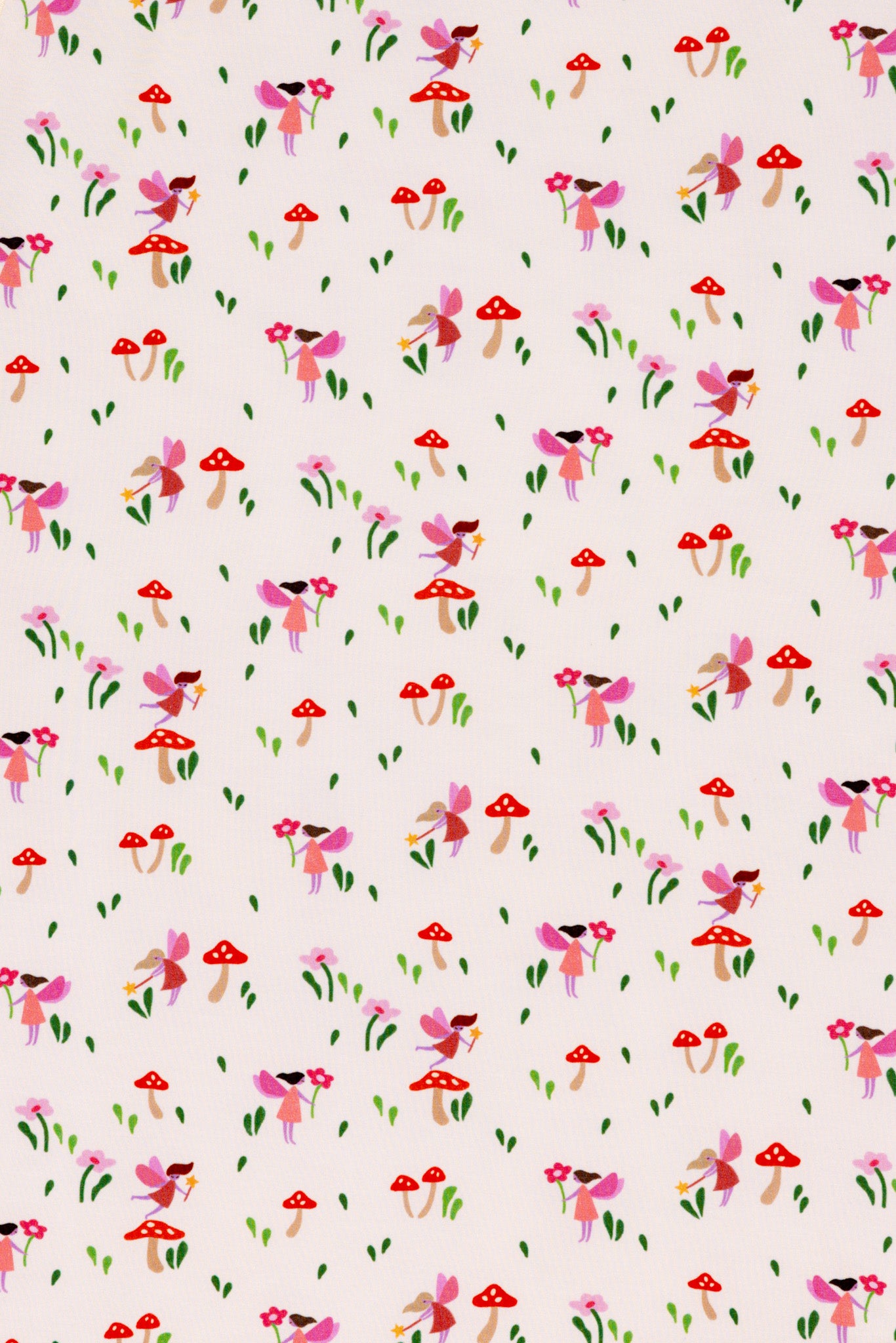 A soft cream base scattered with playful woodland mushrooms in warm, cheerful tones.